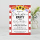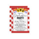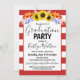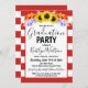 En söt inbjudan till studentfesten med solblommor och rött rand.