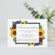 Designen har eleganta solrosor, rosor och vilda blommor med en färgpalett i gult, burgunderrött och blått. Designen har också en ram i kolgrått. Du kan ändra bakgrundsfärgen på framsidan och baksidan till den färg du väljer eller låta båda vara vita.