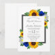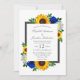 Designen har eleganta solrosor, rosor och tusenskönor med en gyllengul, blå och vit höstfärgs palett. Designen har också en ram i kolgrått. Du kan ändra bakgrundsfärgen på framsidan och baksidan till den färg du väljer eller låta båda vara vit.