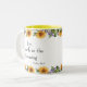 Joy kommer in i morgonskriften mugg med ljusa solblommor och lavender gräns