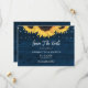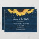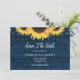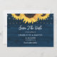 Personlig Blå rustiskt trä och solroskort bröllop spara datum med solrosblommor på rustik träbakgrund. Två stövlar på baksidan. Matchande objekt är tillgängliga.