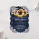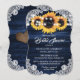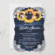 Vacker rustik marin blått och solrosblomma inbjudningskort för möhippa med solrosblommor och vit blommigt snöre mot bakgrund av rustiskt trä. Matchande objekt är tillgängliga.