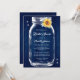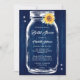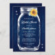 Personlig: Rustik marin blått och solrosblå inbjudningskort för möhippan med en mason burk med solros och grön mot en lada med träbakgrund. Matchande objekt är tillgängliga.