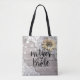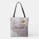 Budens mamma Bröllop Tote Bag-mallar - Vintage Snöre, solros och String Ljus på Rustic Wood Background. En Perfekt för din stora dag! Alla textstorlekar i Stil, Färg kan anpassas efter dina behov.