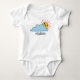 Söt baby bodysuit glad gul solsken som tittar ut från ett stort blått moln med en mall nedan för att lägga till ditt namn, citat, text eller ta bort för att lämna tomt.