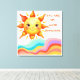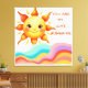 Retro vågig väggkonst. Designen visar en vänlig leende sol som går upp över en serie färgrika, flödande regnbågsvågor i en fantasifull handritad stil.