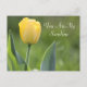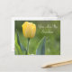 En gult tulpanbask glatt i solskenet mitt i en bakgrund av vår grönt gräsmatta. Fotografi och design av Victoria Lynn Hall.