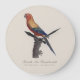 Denna illustration presenterar en praktfullt färgad solparakit-hane, återgiven i en klassisk naturalhistorisk stil som påminner om tidiga ornitologiska verk. Fågeln visas sittande på en strukturerad gren, med en lugn men alert kroppshållning. Dess fjäderdräkt strålar av intensiva färger – elddorange över ansikte och bröst, övergående till gyllengult längs kroppen, och kontrasterad av djupgröna och blå vingpennor. Kompositionen och de fina detaljerna speglar inflytandet från Jacques Barraband, vars arbete med att dokumentera exotiska fåglar kombinerade vetenskaplig precision med konstnärlig elegans. Inskriptionen ”Perruche Ara, Guarouba mâle” knyter bilden ytterligare till historiska europeiska tolkningar av sydamerikanska papegojor.