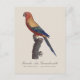 Denna illustration presenterar en praktfullt färgad solparakit-hane, återgiven i en klassisk naturalhistorisk stil som påminner om tidiga ornitologiska verk. Fågeln visas sittande på en strukturerad gren, med en lugn men alert kroppshållning. Fjäderdräkten strålar av intensiva färger – elddunge orange över ansikte och bröst, övergående till gyllengult längs kroppen, och kontrasterad av djupgröna och blå vingpennor. Kompositionen och den fina detaljrikedomen speglar inflytandet från Jacques Barraband, vars arbete med att dokumentera exotiska fåglar kombinerade vetenskaplig precision med konstnärlig elegans. Inskriptionen ”Perruche Ara, Guarouba mâle” knyter ytterligare bilden till historiska europeiska tolkningar av sydamerikanska papego