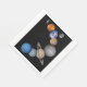 Överst till grund: Kvicksilver, Venus, Jord med Måne, Mars, Jupiter, Saturn, Uranus, Neptune.