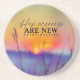 Rund sandstone Underlägg en vacker vattenfärgsmålning med en enkel orange och gult soluppgång över ett dimmigt blått fält. Det är ett inspirerande citat: "Hans meriter är nya varje morgon."