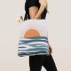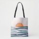 Abstrakt illustration av soluppgången med orange sol och blå, vit och turkos havs vågar dekoration
