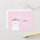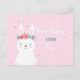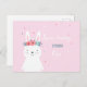 En födelsedagsinbjudningskort med en söt vit kanin med blomsterkrans på huvudet.