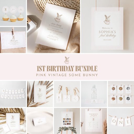 A timeless vintage bunny illustration with soft neutral color palette and delicate pink ribbon detail. Designed for a sweet first birthday celebration with a classic stripe background and elegant typography. Great for invitations, party decor, and keepsake prints.