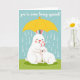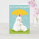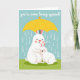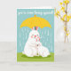 This card shows two white, rabbit-like characters centered on the front, with the larger one wrapping its arms around the smaller in a close cuddle 🐰. The smaller figure rests with eyes closed, leaning into the embrace as if soothed by the steady hold, and both have soft pink blush on their cheeks. Above them, a bright yellow umbrella opens wide, angled slightly to cover both heads like a shared shelter. The background is a pale blue sky dotted with small white raindrop shapes that fall around the umbrella, adding a gentle, cozy mood 🐇. Along the top, the phrase “you’re some bunny special!” is placed in white lettering, standing out against the blue. A narrow green strip at the bottom suggests simple grass, keeping the setting minimal and focused on the pair. The umbrella’s curved handle and the scattered white raindrops sit clearly against the light sky.
