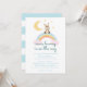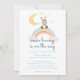 Denna inbjudan är en del av samlingen "Some Bunny is on the Way" för baby shower, som innehåller söta mönster med akvarellkaniner, påskblommor, regnbåge och moln i könsneutrala färger (brun, orange, beige, gul och rosad rosa).