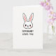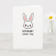 This card features a simple bunny face centered on a bright white background, drawn with smooth black outlines that keep the look light and open 🐰. The bunny’s tall ears stand upright with soft pink inner shading, as if it’s leaning in to listen closely to someone it cares about. Two round black eyes and gentle pink cheek circles give it a shy, affectionate expression, like a quiet crush or a close friend sharing a sweet moment. A tiny mouth shaped like a small “w” sits low on the face, adding to the tender, bashful look. Beneath the bunny, the phrase “SOMEBUNNY LOVES YOU” is placed near the lower center in rounded, hand-drawn uppercase lettering. The text appears in black, standing out clearly against the white space while echoing the bunny’s outline for a cohesive design 🌷. The overall layout leaves plenty of open space around the character and words, with the pink accents limited to the ears and cheeks. The bunny’s ears are the tallest elements on the page, with the message neatly aligned below the face.
