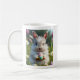 A fluffy white baby bunny gently holding a colorful hand-painted Easter egg. Captured in soft spring sunlight with a dreamy background of green grass and blooming flowers. Pure cuteness and Easter joy in one frame
