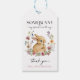 Tacka dina babyshowergäster med dessa matchande tacksamhetsmärken. Fäst dem på dina babyshowerpresenter, gåvor, godsaker och mer. Denna design har en delikat kransbukett med handmålade vilda blommor som omger en söt liten kanin. En vacker kombination av moderna och rustika typsnitt fullbordar denna söta design. Se hela kollektionen för fler matchande artiklar!