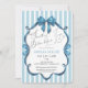 Something Blue Before I Do Blue Bow Bridal Shower Invitation. Celebrate the bride-to-be with this charming "Something Blue before I Do" bridal shower invitation featuring a beautiful dusty blue bow and elegant script typography. The design is set against a delicate pale blue and white striped background, creating a sweet and classic aesthetic. A beautiful, hand-painted dusty blue bow adorns the top, adding a touch of delicate charm. This invitation is perfect for a spring and summer bridal showers. Make her special day even more memorable with this delightful announcement.