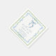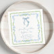 Chic bridal shower napkins featuring vintage grandmillenial-inspired green scallop and blue floral watercolor frames, a delicate blue coquette bow watercolor, "something blue before I do" showcased in an elegant blue calligraphy script, and the name of the bride and shower date in classic serif typography.