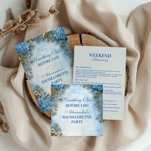 Celebrate in timeless winter elegance with this Something Blue Before I Do bachelorette party invitation. Designed with frosted florals, icy blue hydrangeas, and soft pine accents, it blends seasonal beauty with a romantic bridal touch. The classic script layout highlights all event details clearly, while the subtle snowy texture creates a dreamy, feminine atmosphere. Perfect for brides who love winter themes, soft blues, and refined floral aesthetics. Fully customizable to match your party style.