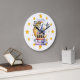 This fun clock design features an a stack of books with a sorcerers hat. In the background there’s a crescent moon and stars. Instead of numbers, this clock has stars. The text reads ”Something Magical Happens When You read A Book”. A perfect addition for any child's room.
