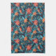 En vacker kökshandduk med ett sömlöst pappert blommönster mot blå bakgrund.