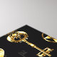 Sömlös mönster av antika, guld och silhuette nycklar mot svart bakgrund.