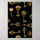 Sömlös mönster av antika, guld och silhuette nycklar mot svart bakgrund.