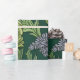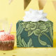 Sömlöst William Morris-inspirerat tapet mönster med tät grön lövverk och stora, rundade blommor i nyanser av limegrönt, off-white och dämpad lavendel mot en mörkgrön bakgrund.