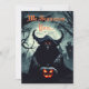 Ta en promenad på mörken och verkligen stå ut med den skrämmande röda ögonbrynen Halloween fest inbjudan. Framsidan har en hornerad, röd, djävulsk demon som klämmer en svart pumpa Jack o lantern med matchande rött orange ögon. Baksidan har en svart skuggad orange med svart vintage. Skapat av Farmhouse Press.