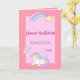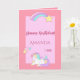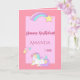En söt unicorn och en regnbåge med stjärnor. Pastellbakgrund för rosa och mörkare rosa ram. Mallar för namn och år. Med texten: Grattis på födelsedagen! skriven i mörkens rosa och med faux glitter. Rosa med ramar inuti och utrymme för skriva för hand. Matchning av frimärke är tillgängligt.