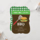 Modern sommar grillfest barbeque fest inbjudan med en hamburgare och stekspade på en brun bakgrund med en grön gingham kant. Vänd vår inbjudan och hitta en matchande baksida för en extra speciell touch. Perfekt för en minnesdag fest, 4 juli fest, arbetsdag fest, familjeåterförening eller en pool fest.