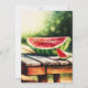 Giant juicy hamburger sitta på ett pickniskt bord med Summer BBQ och din text. Ryggen har en vattenmelon sitta på ett pickniskt bord.