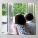 Pojke och tjej tittar ut ett fönster vid sommarregnet