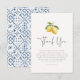 Ett elegant tackkort som matchar vår Bridal Shower kollektion "Summer Lemon & Mediterranean Tiles". Designen har en vacker, handmålad akvarellillustration av två citroner och citronblommor som hänger från en trädgren. Under finns ett personligt och hjärtligt tackmeddelande för att uttrycka din tacksamhet mot vänner och familj. Baksidan av designen har målade blå italienska plattor som ger en touch av medelhavs charm till denna design. Se kollektionen som är länkad på denna sida för den matchande bröllopsduschuppsättningen. Skicka gärna ett meddelande om du har några frågor, jag hjälper dig gärna!