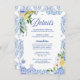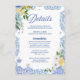 Färdigställ din brölloppssvit med detta eleganta tilläggskort för sommarbröllop med Medelhavsinspiration och motiv av citron, som har handmålade akvarellcitroner, mjuka blå accenter och klassiska italienska kakelplattmönster. Perfekt för destinationbröllop, firanden på Amalfikusten eller för alla par som planerar ett romantiskt citron-tematiserat sommarbröllop.