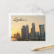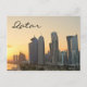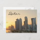Skyscrapernas vykort i handelscentret i Doha, huvudstaden i Arabiska Bukt land Qatar vid solnedgång med tekst: Qatar.
