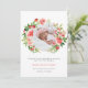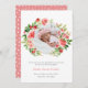 Mall för rosa av elegant vattenfärg med blommigt för födelseanmälan med illustration av rött vattenmelon och bär med blommigt lätt rosa ros och grönt löv på framsidan. Baksidan visar en koral rosa-polka-punktbakgrund. På framsidan, en bild till din nyfödda som kan läggas till på detta kort. Använda en fyrkantig storlek bild så att den passar lätt. Perfekt kort för att meddela att nyfödd bebis kommer med sin födelsestatus. Underbar för både pojke och flicka. Perfekt för sommar- och vår-säsonger!