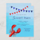 En inbjudan till elegant om en sjökust vid sommaren party, stranden party eller party. Blåhavets vatten som bakgrund och en stor röd hummer och svart och rött flaggor som dekoration. Mallar för information om party. 1 lakan = 1 inbjudan tryckt kant till kant.