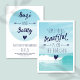 "Något vackert är vid horisonten" citat på inbjudningens baksida är en fin fingervisning för att presentera din bröllopsdag för dina gäster. Ett blått hav, sommartema för ett badbröllop. Meddelande om andra objekt som du vill matcha det här temat.