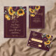 Sommaren bröllop Burgundy och gult solblommor, grönt burguny bakgrunden till guld ram boho rustic blommigt bröllopsinbjudan allt i ett med QR OSA och bröllop detaljer i baksidan.