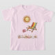 Summer T Shirts för barn. Ljusskygg sol, gult, blå röd och vit strimlad strandstol, segelceller och sött rött och vitt flinflip flops.