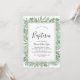 Denna sommardop invitation med grönska är perfekt för en elegant midsommarbarnedop. Den botaniska designen har en frodig arrangemang av handmålade akvarell eukalyptus, grönska och livfulla gröna blad som frammanar en fräsch, naturlig känsla. Med sin lugna och sofistikerade estetik sätter denna invitation vackert tonen för en minnesvärd och meningsfull firande. Fullt anpassningsbar för att matcha din stil.