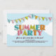 Färgfull typografi och buntning av flagga i polkadot och rand mönster har utgjort scenen för en roligt sommar-Party! I fina skuggor av vattenhaltig teal, orange, rosa, kalkgrönt och gult, allt mot en blå himmel och fuktig vit moln. Fungerar underbar för party, grillar, kakor eller pickniker i bassäng eller strand - alla sommartider i firande. Skapa ett underbarare samordnat utseende med våra matchande frimärke-, tallrikar- och DIY-bankkort!