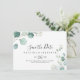 I sommar är grönten Eucalyptus foliage vågrät bröllop spara datum en perfekt för ett modernt bröllop. Utformningen har vackra, handmålade vattenfärgade löv av grönten eukalyptus, inspirerande naturcharm.
