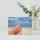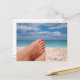 Vykortet av kvinna fot med den rosa röda nageln som är polsk på en vitstrand på en ö i det medelhavs- havet som kopplar av under sommaren, semestrar.