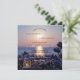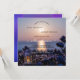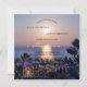 En bröllopsinbjudan med en solnedgång i havet med ett konstnärligt designmönster med mousserande ljus. Vackert för ett vinterbröllop.