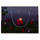 I skymningen av en sommarnatt flyter eldflugor över en ro-trädgård fylld med vibrerande röd ros.